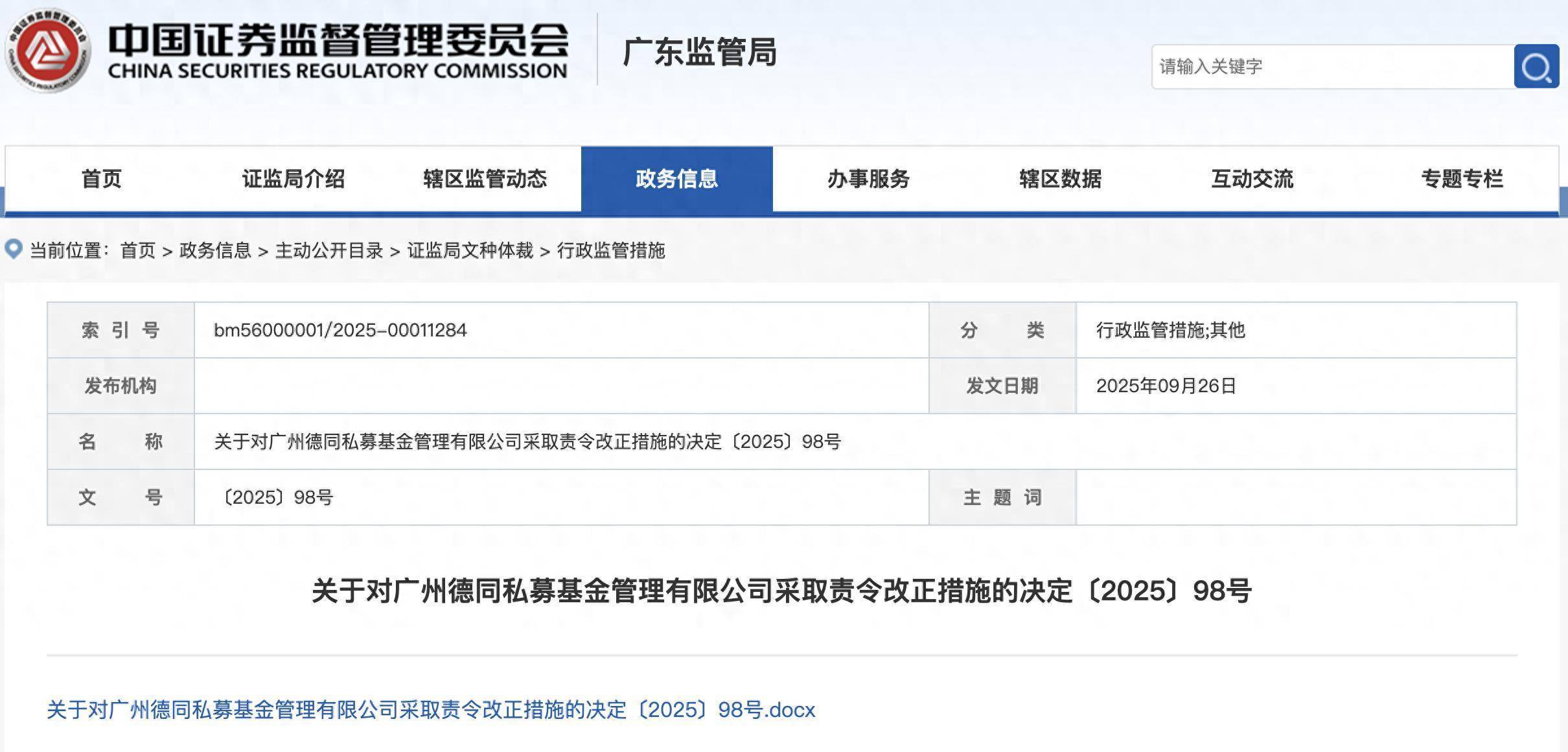 近日,据广东证监局官网,广州德同私募基金管理有限公司收到了责令改正的行政监管措施。